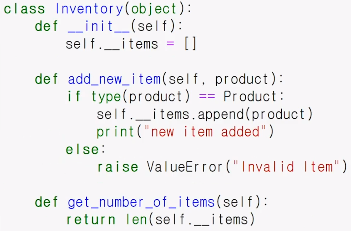 위 사진처럼 속성에 __을 붙이면 외부(인스턴스)에서 접근 할 수 없음(내부 로직에서만 사용)
