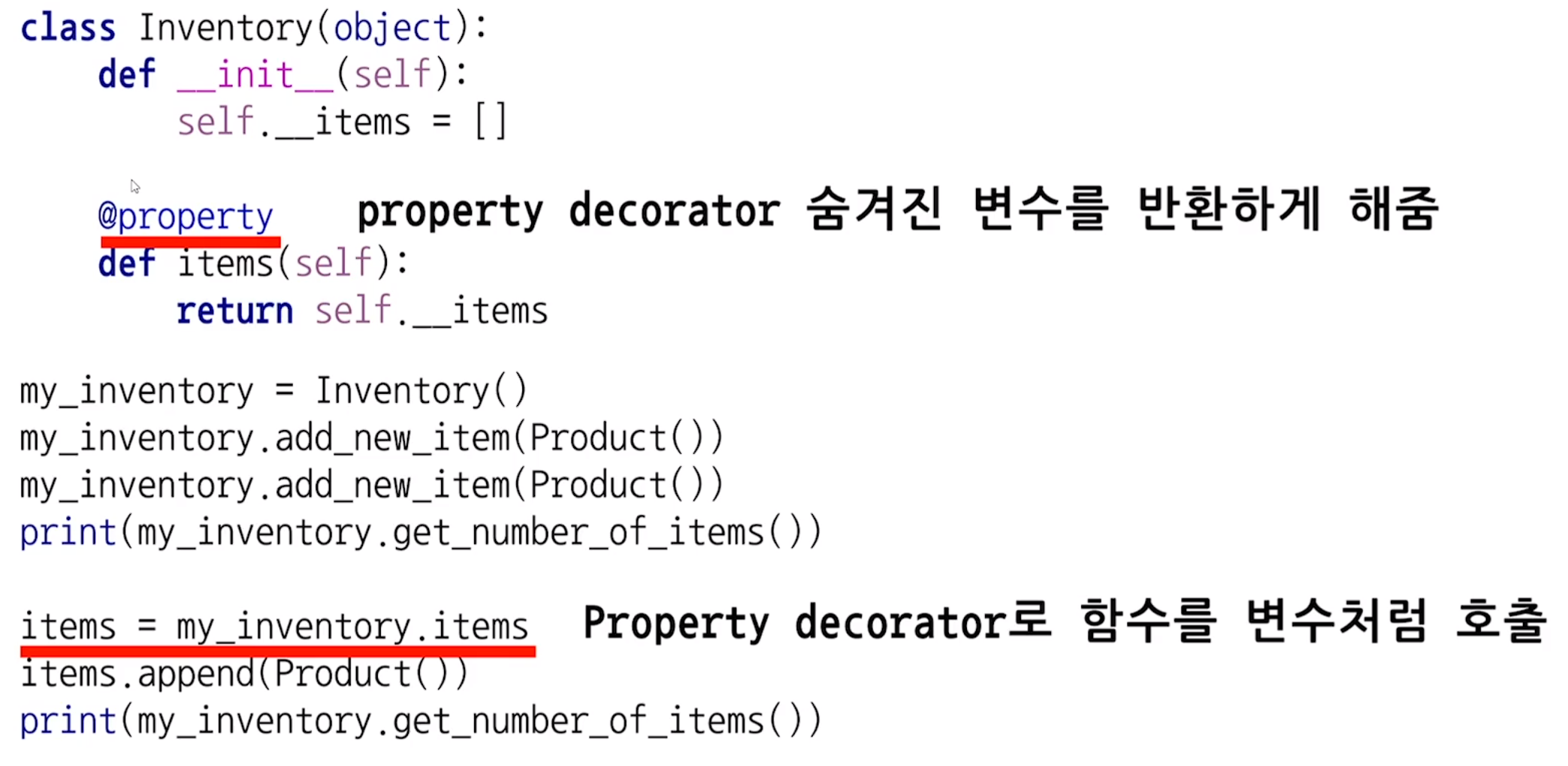 @property (데코레이터라고 부름) 를 사용해서 접근을 막아둔 속성(__가 붙은 것)들을 접근할 수 있도록 해줌