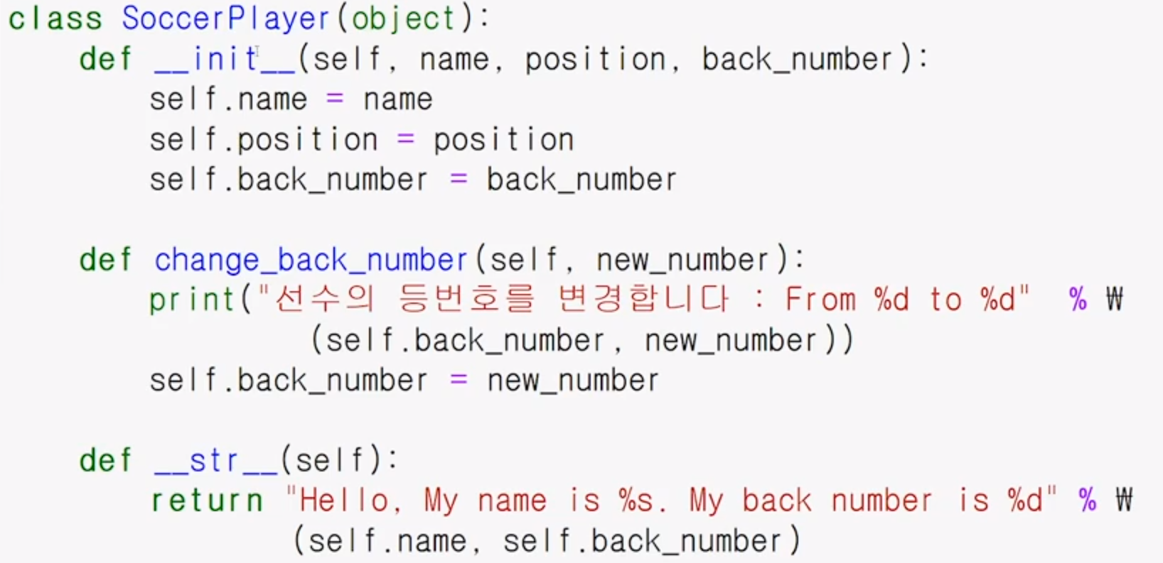 파이썬 클래스에는 __[ ]__ 모양을 하고 있는 특수한 함수들이 여러개 존재하는데 그중 __str__ 함수는 인스턴스를 출력시 출력할 내용을 return 하는 함수이다