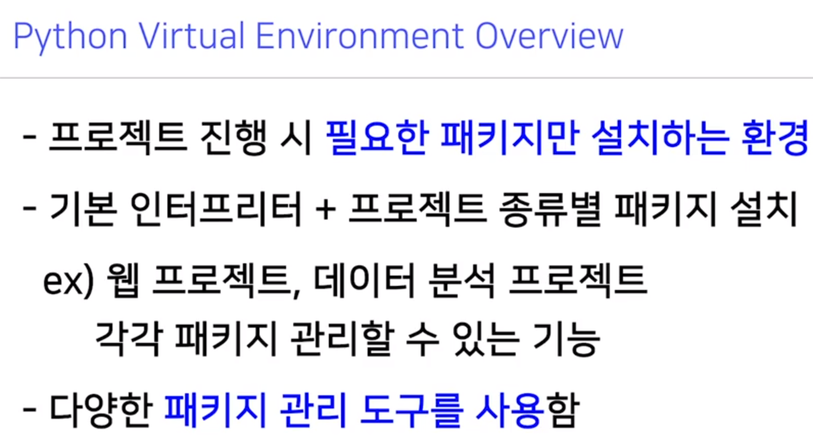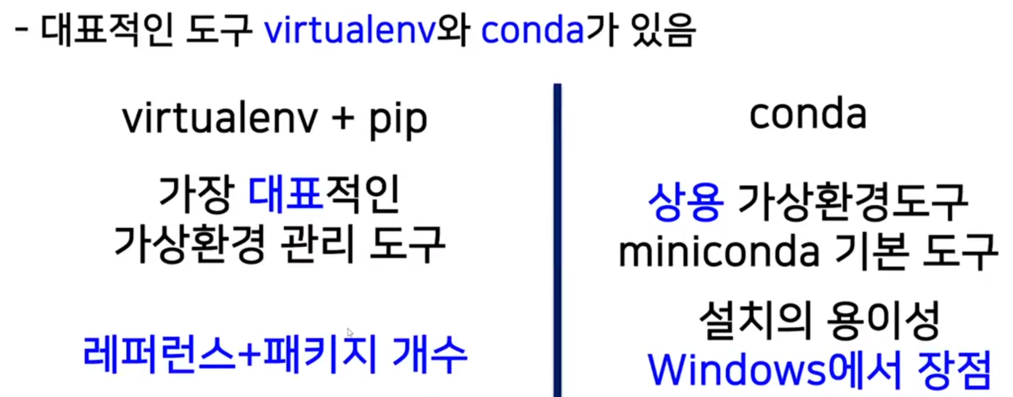 둘중해서는 conda를 주로 사용(강사님 피셜, 그냥 강사님이 conda를 상당히 좋아하는 듯)