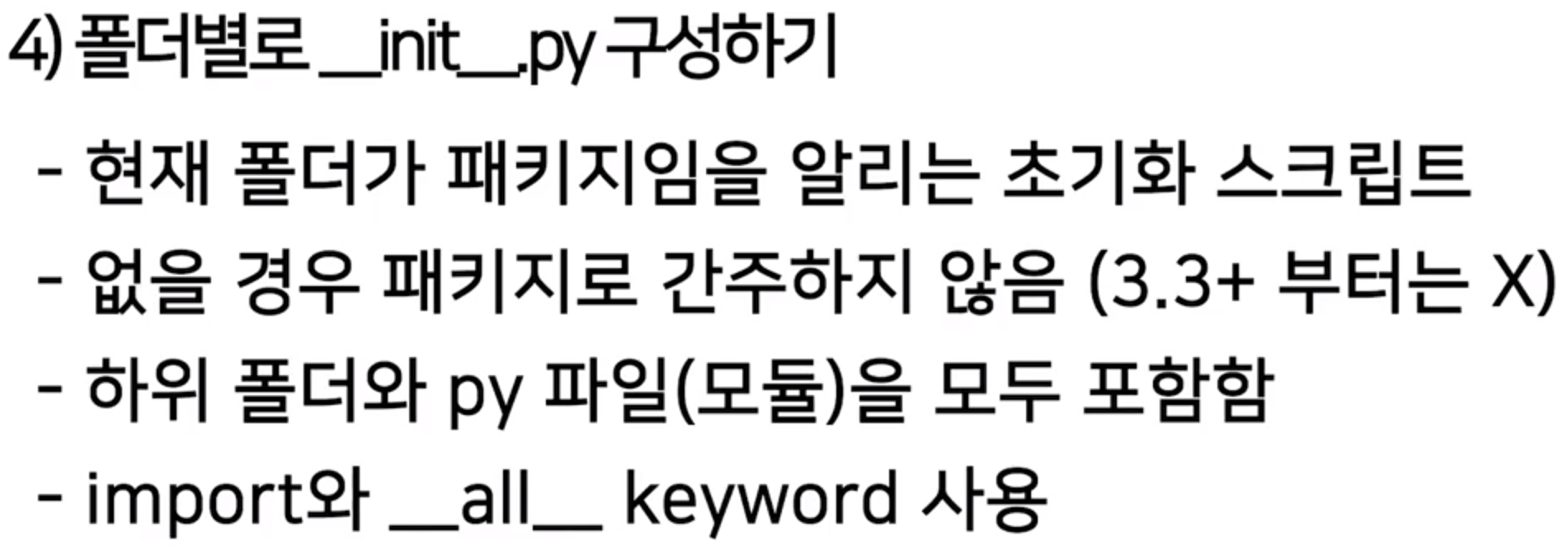 폴더별로 __init__을 설정하여 패키지(모듈 모음집)라는 것을 알리는 것, 파이썬 3.3버전부터는 필요없지만 그래도 해주는게 관례