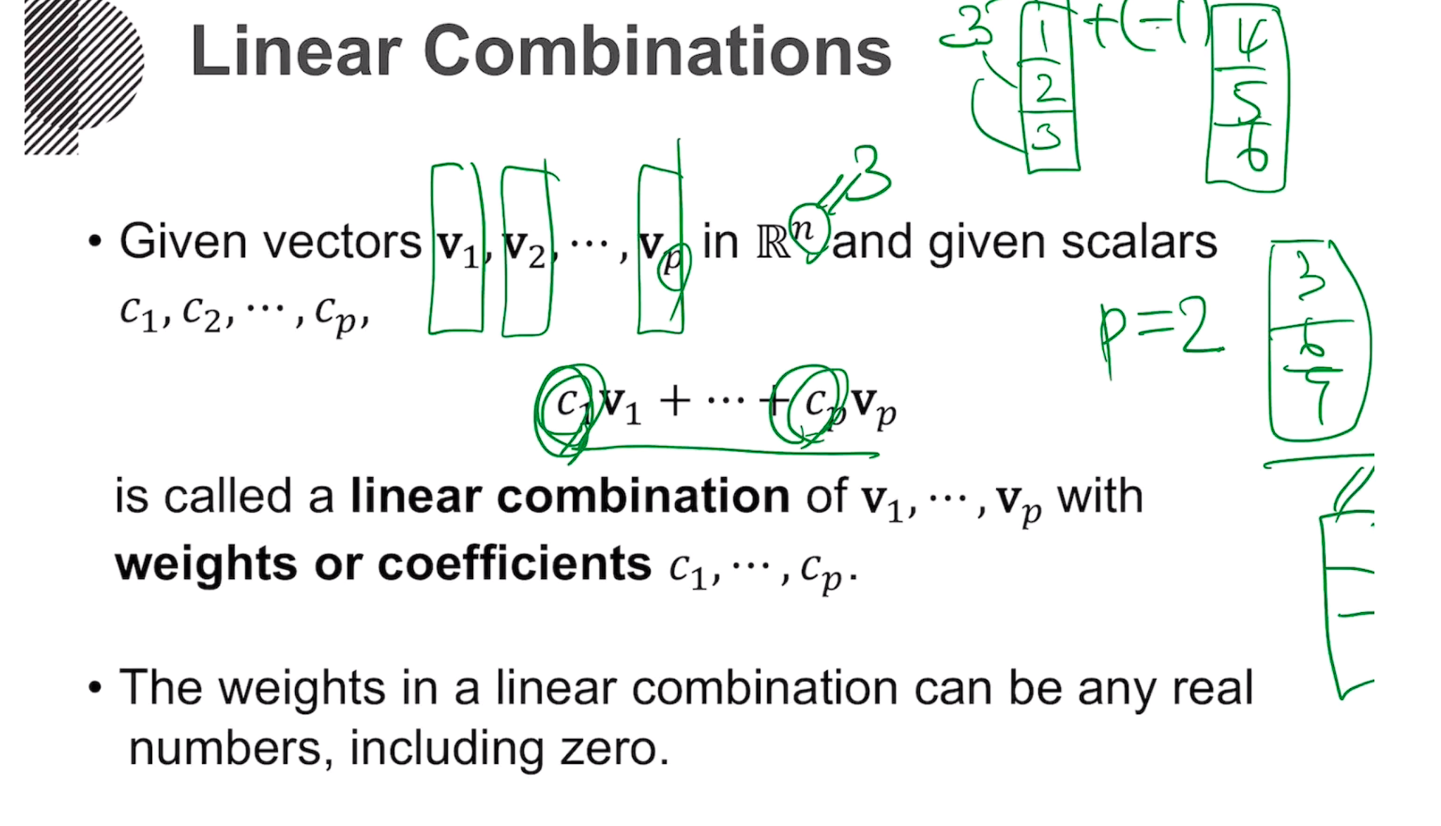 벡터와 스칼라(가중치)의 곱으로 이루어진 덧셈 연산을 선형결합(벡터 방정식)이라고 한다