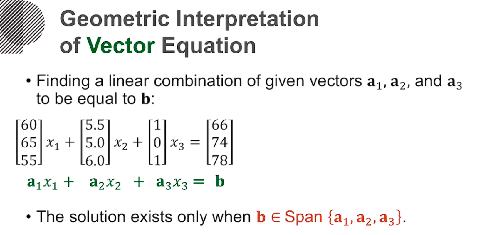 3개의 재료벡터와 미지수 x(가중치)의 선형결합으로 가능한 모든 경우(span)을 만들어 봤을때 그 span에 우항의 벡터가 포함되어 있다면 해(x1,x2,x3)가 있는 것이고 그렇지 않다면 해가 없는 것이다