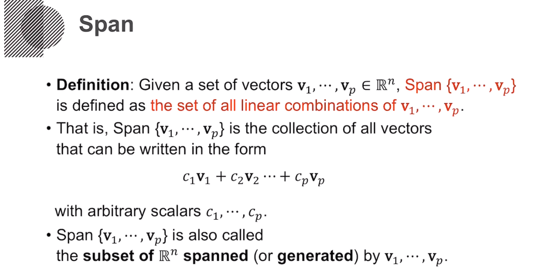 span : 재료 벡터를 가지고 만들 수 있는 모든 선형결합(벡터)의 집합